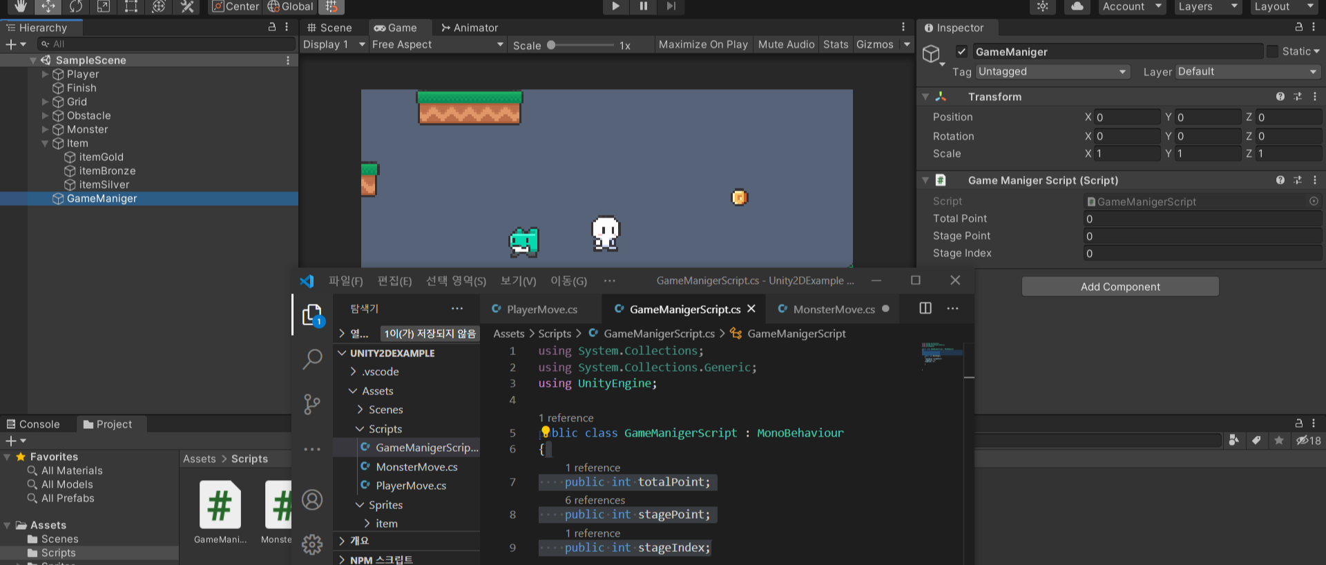 - 유니티엔진에 퍼블릭으로 생긴 빈공간에 (2)에서 스크립트를 드래그앤 드랍으로 넣은 GameManiger오브젝트를