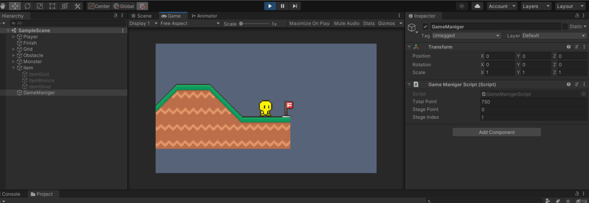 (1) -게임매니저 스크립트에 퍼블릭으로 토탈점수, 스테이지점수, 스테이지인덱스 생성