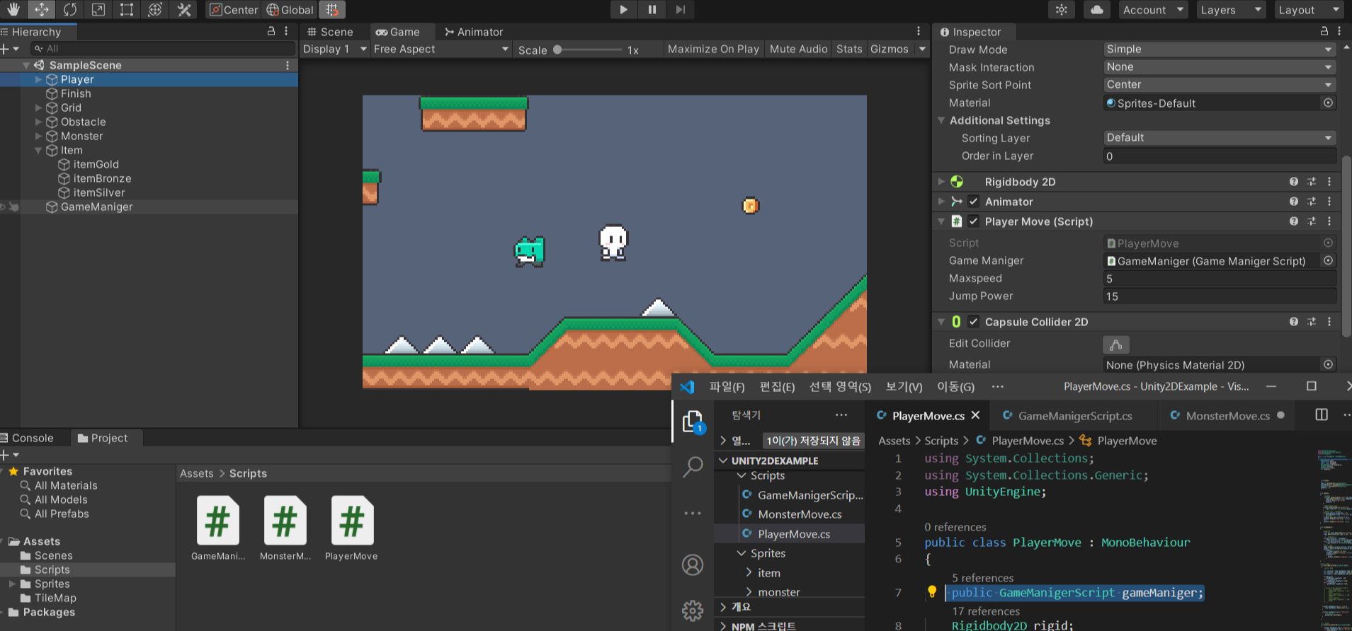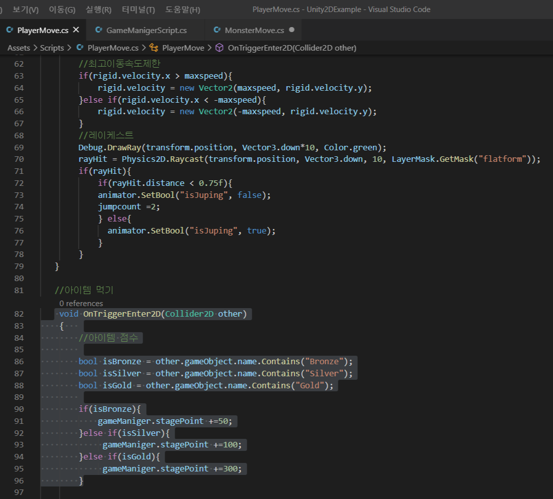 (3) - PlayerMove 스크립트 안에서 public GameManigerScript로 gameManiger라는 변수를 선언하고