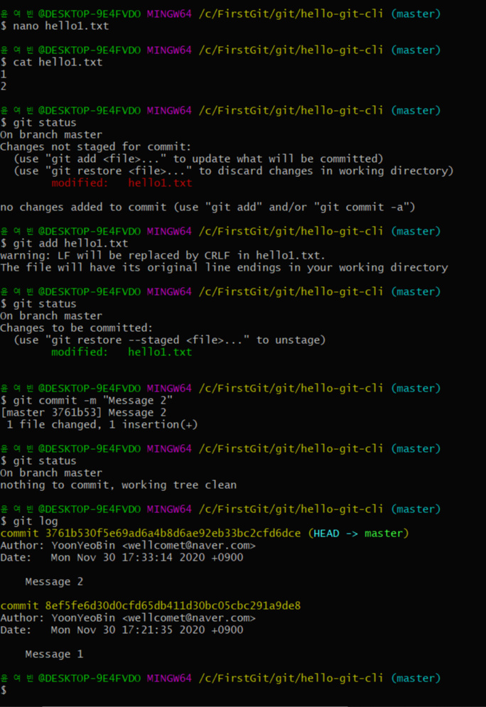 6. git commit -m "Message 1" 이라는 명령어로 Staging Area에 올려져 있는 hello1.txt라는 파일을 버전으로 만든다