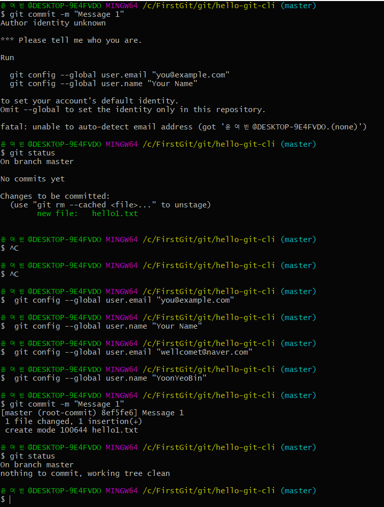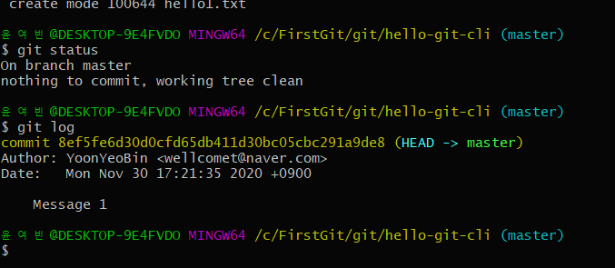 6. git commit -m "Message 1" 이라는 명령어로 Staging Area에 올려져 있는 hello1.txt라는 파일을 버전으로 만든다