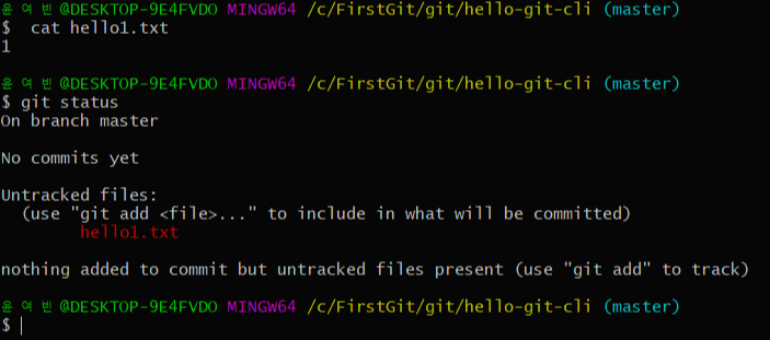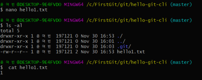 3. cat hello1.txt(해당 파일의 내용을 보여주도록하는 명령어)를 하면 작성한 1이 출력됨