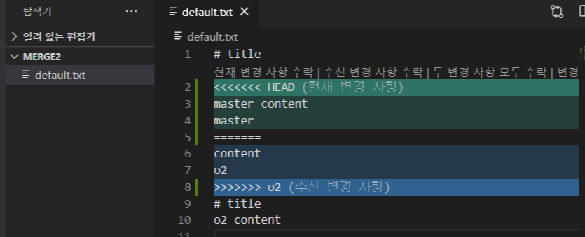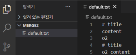 (8) - 병합된 새로운 default.txt 파일 버전이 생성됨 # title / master content # title / o2 content