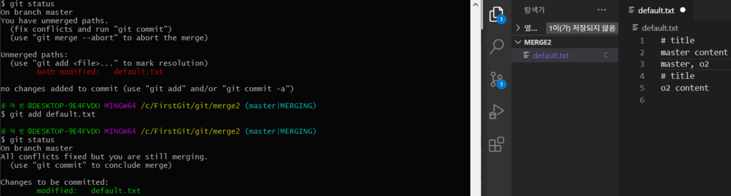 3.하나의 default.txt 파일에 2개의 branch로 각각의 변화를 주고 그 둘을 merge하기
