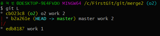 (2) - git merge o2를 하여 o2 브런치를 master 브런치에 병합 한다