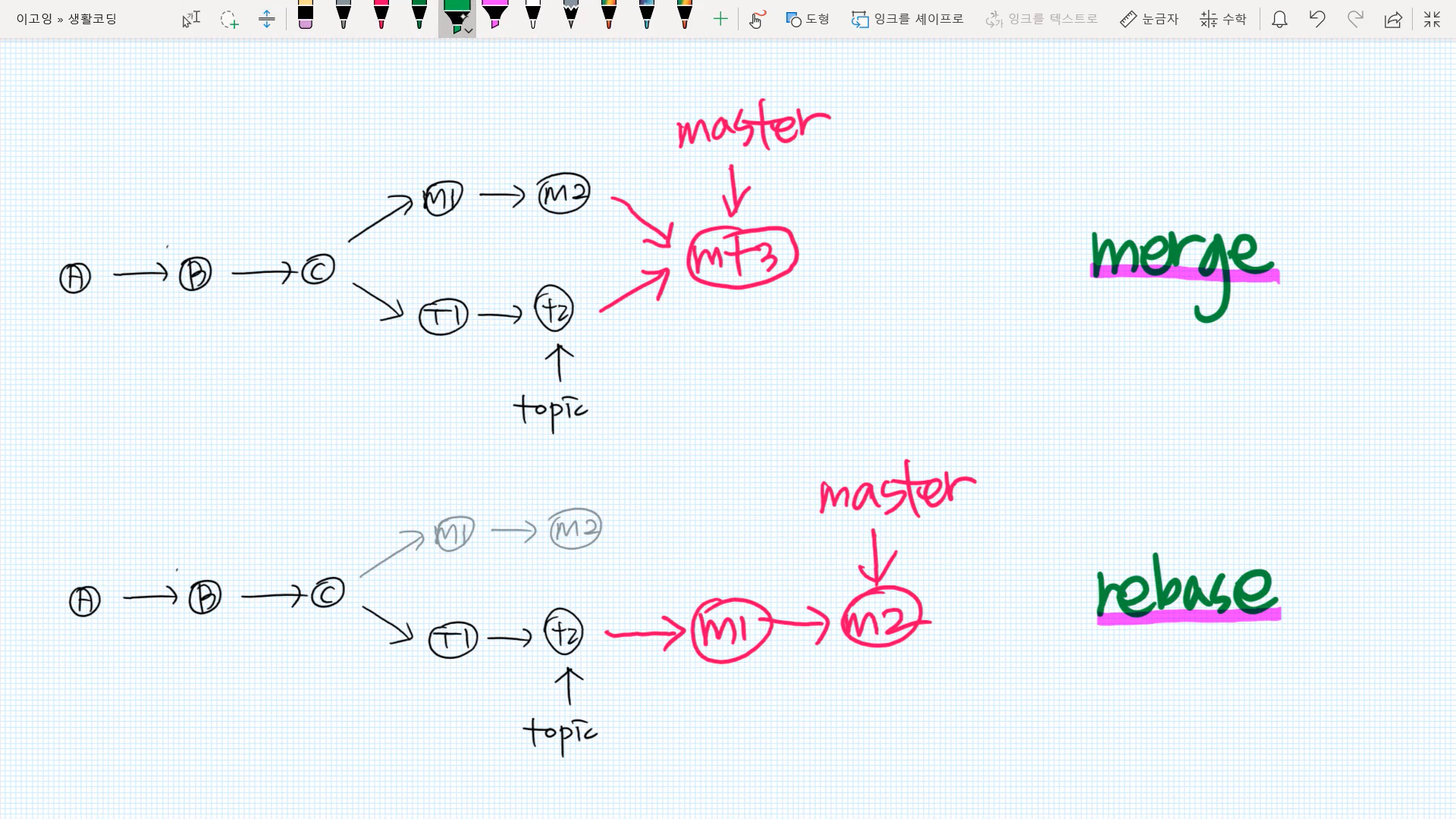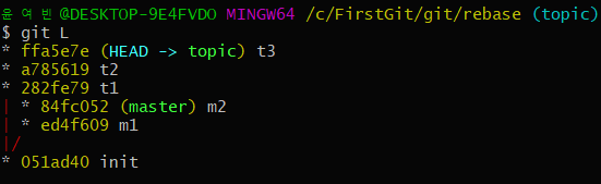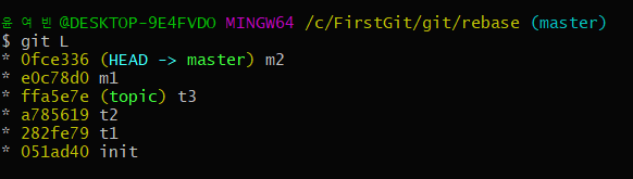 - m1을 마스터로 두고 m1의 베이스를 topic으로 하기 위해 m1 rebase topic 을 하게되면