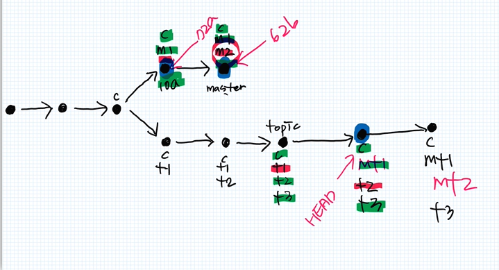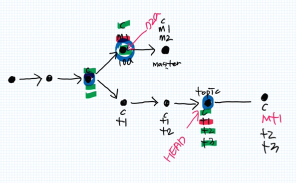 - git은 topic으로 HEAD를 옮기고 C를 BASE로하여 M1과 비교하여 그 차이점인 m1이라는 내용을
