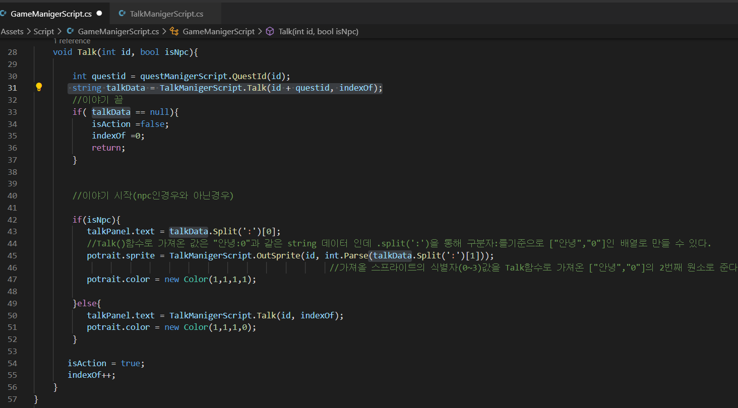 *50번째 줄의 TalkManigerScript.Talk(id, indexOf)부분도 talkData로 바꿔주고 talkManigerScript에 10번퀘스트의 물체 관련 대화도 만들어 줘야함 그래야 questid가 10일때 일반물체와 대화할때 오류가 안남