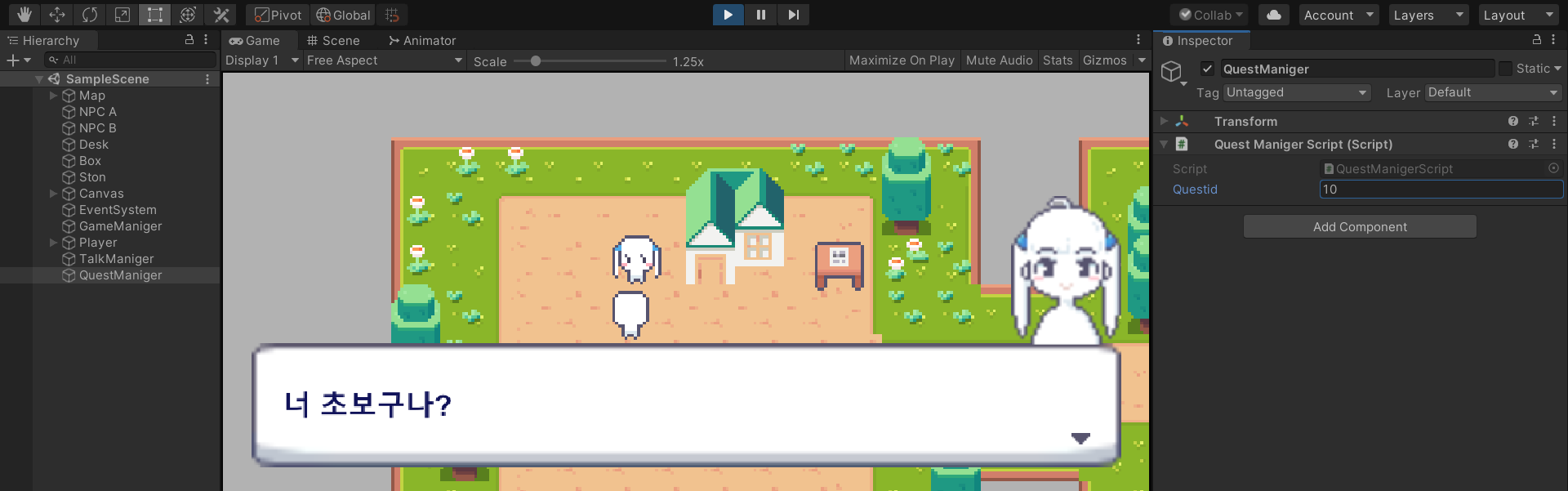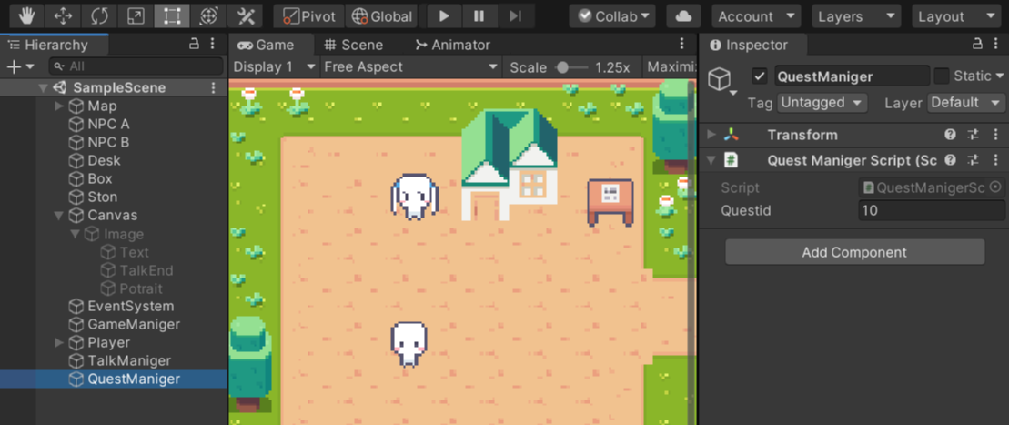 퀘스트이름, 퀘스트관련npc 정보를 QuestManigerScript에 만들어놓은 것임