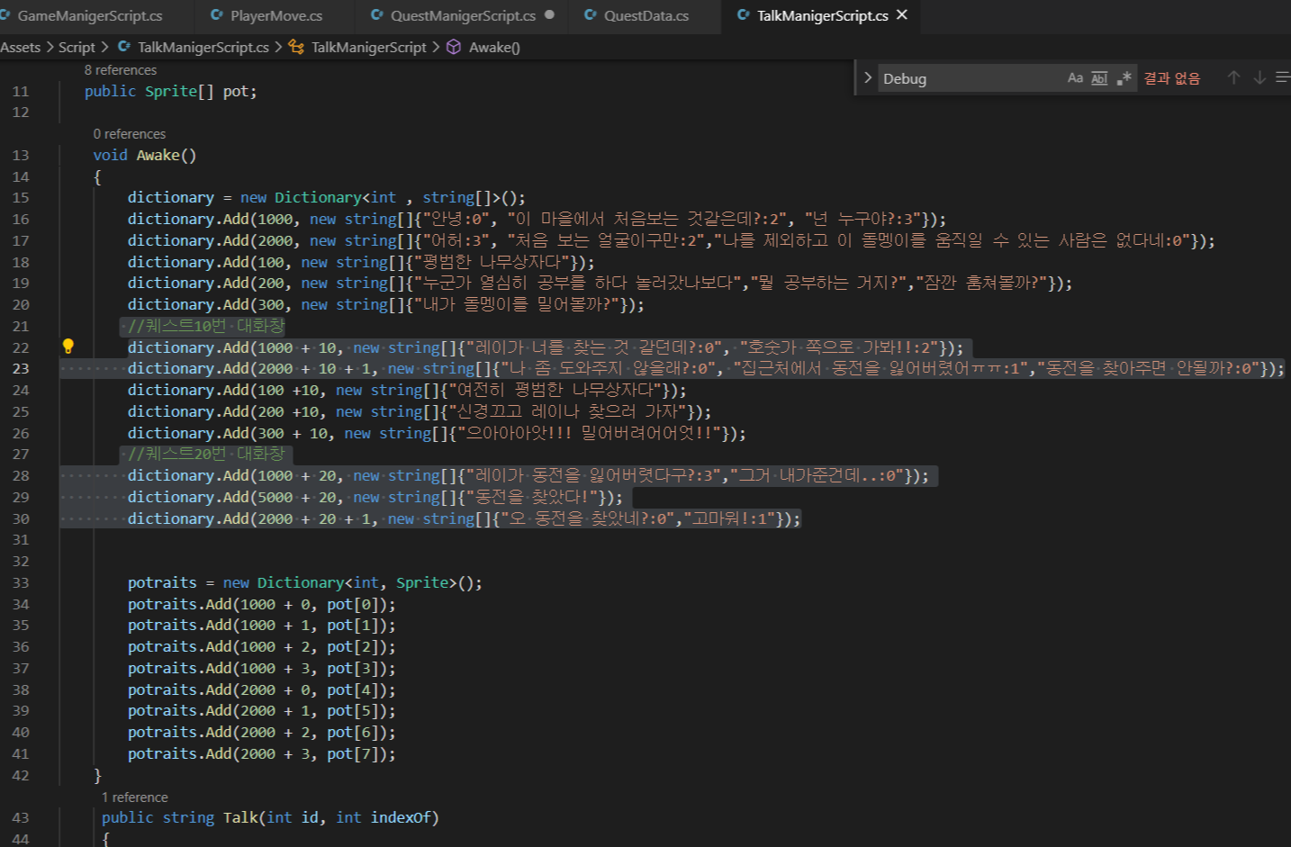 - 20번 퀘스트이면서 해당 동전(id 5000)과 대화를 하여 questIndex가 1로 증가하면 동전오브젝트를 비활성화