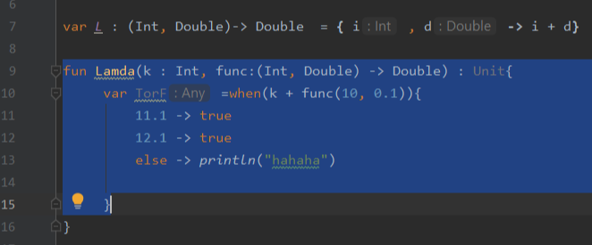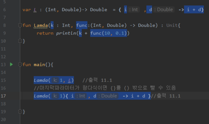 (2) - 1 위 예제 에선 Lamda(k:1){i:int,d:Double -> i +d }를 사용해서 11.1이 출력되었지만