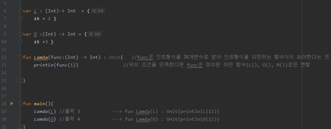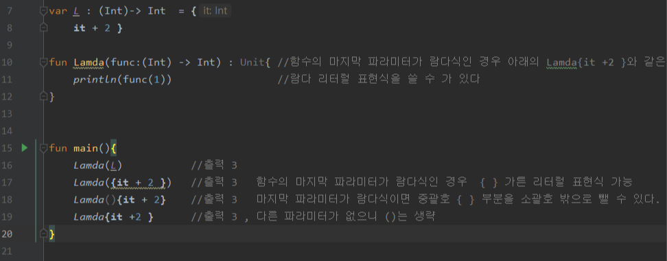 1. Lamda{it +2}는 원래 Lamda({it +2})로 Lamda()라는 함수가 it+2를 리턴값으로 가지는 it이라는 파라미터 1개를 가진 함수(원래 라면 {it:int -> it+2} 라고 쓰여져야하지만 코틀린의 특성상 it:int ->를 생략하고 {it+2}로 표현)를