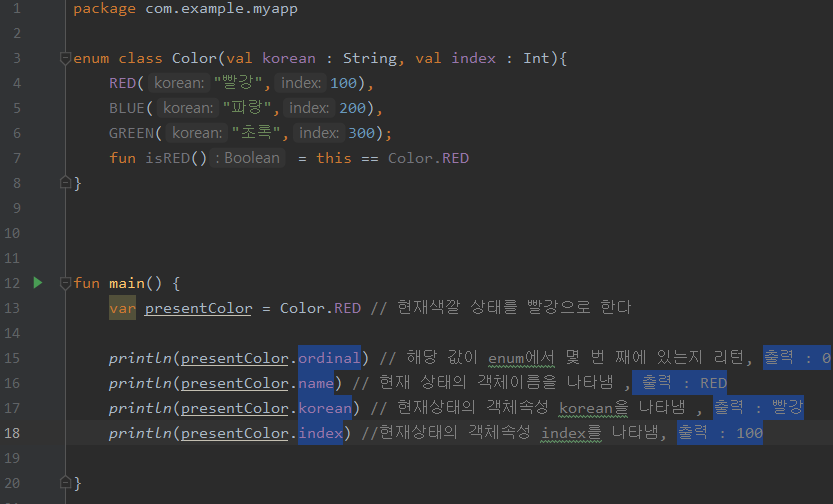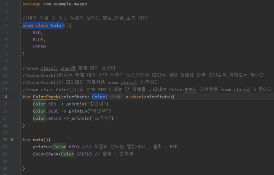 - enum class는 열거형 클래스로 현재상태를 구분하기 위한 객체들을 이름을 붙여 여러개를 생성해두고 그 중 하나의 상태를 선택하여 현재 상태를 나타내기위한 클래스이다