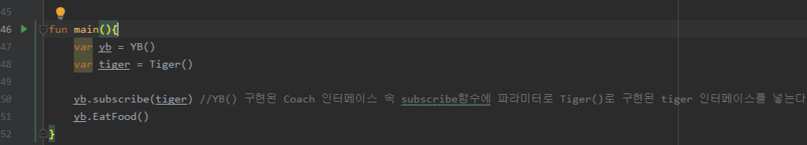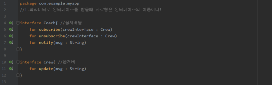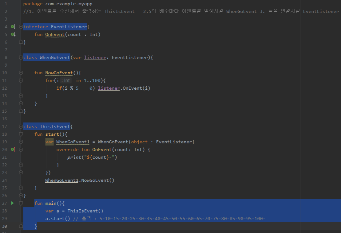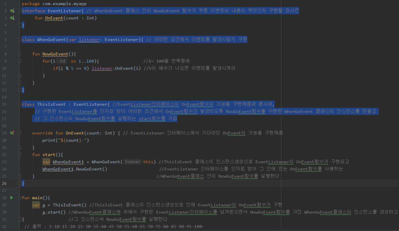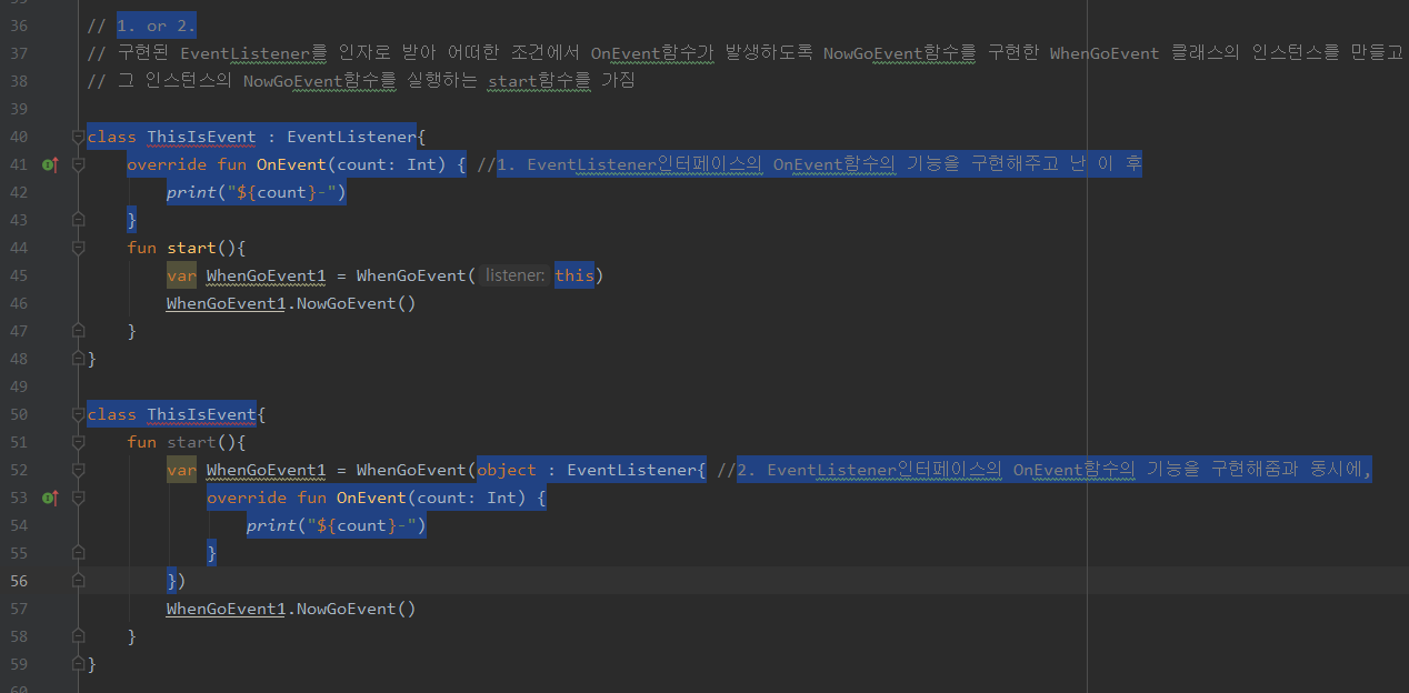 - 위 예시에서의 이벤트 인터페이스의 구현과 이벤트 수신을 담당하는 class ThisIsEvent : EventListener{} 객체는