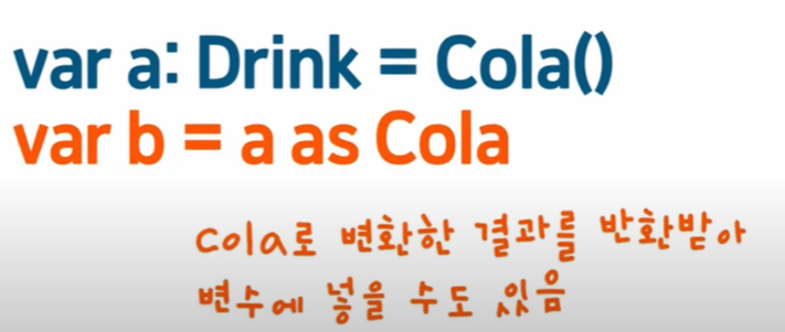 이때 Cola클래스가 가진 순수한 변수와 함수까지 사용할 수 있도록 해주는하는 것을 Down-casting이라고 하고