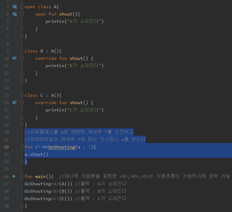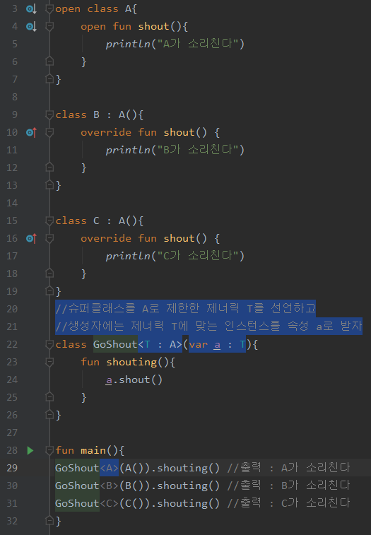 제너릭을 특정한 슈퍼클래스를 상속받은 클래스타입으로만 제한하려면 <T : 슈퍼클래스이름>