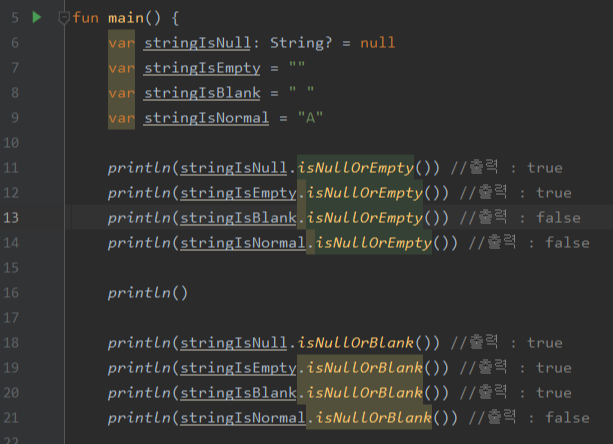*isNullorBlank는 공백문자(space, Tab, Line Feed, Carrige Return)도 비어있는 것으로 판단하여 true를 리턴