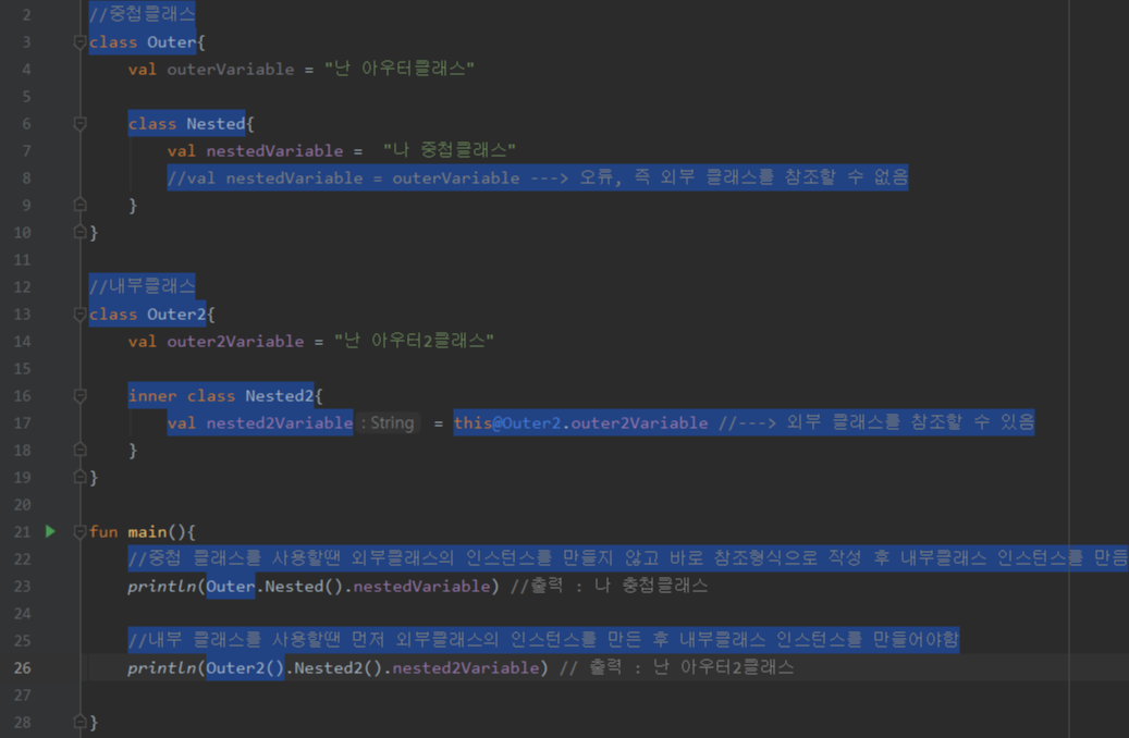 *중첩클래스와 내부클래스는 클래스간의 연계성을 표현하여 코드의 가독성 및 작성 편의성을 제공한다