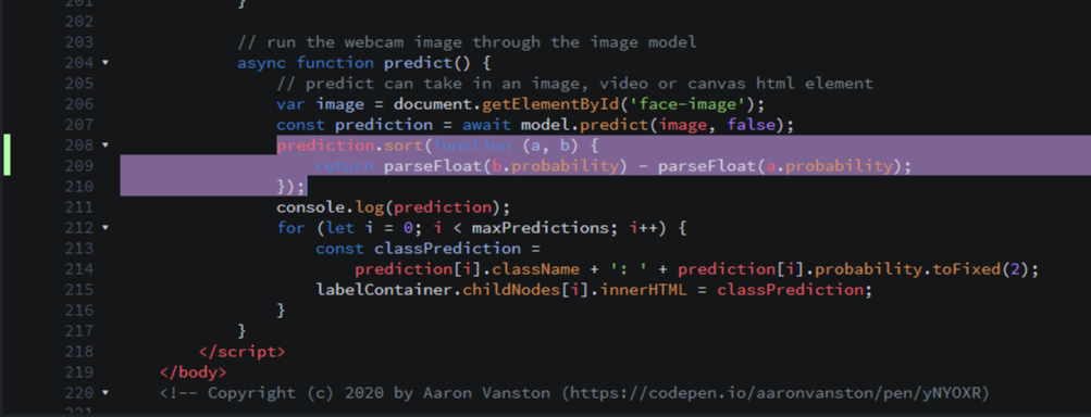 - 이제 probability라는 속성의 값(닮은정도 %)이 가장 높은 객체가 배열의 0번째 원소로 오게 된다