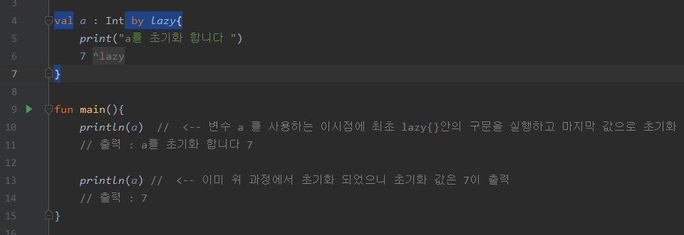 이처럼 변수 선언 val(var x)와 자료형 뒤에 by lazy{ 할당값 } 형태로 쓰이며 람다함수{}를 활용한다