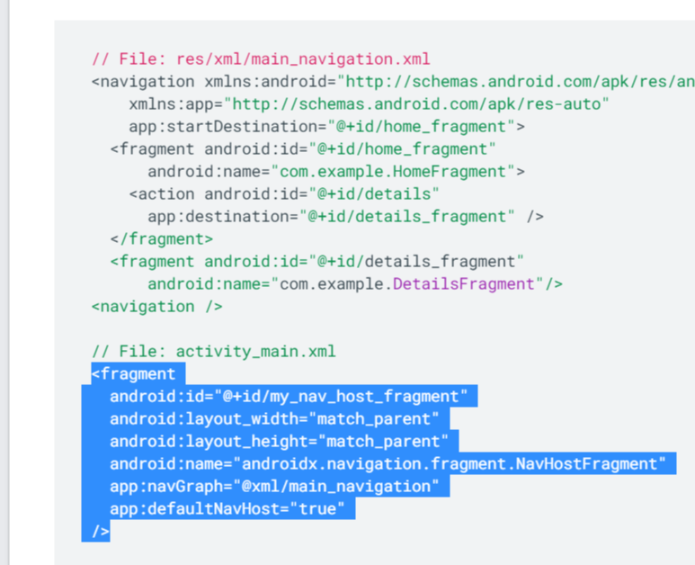 - 네비게이션을 구성하는 fragment들이 움직일 배경이 되는 아래 코드들을 붙여넣음