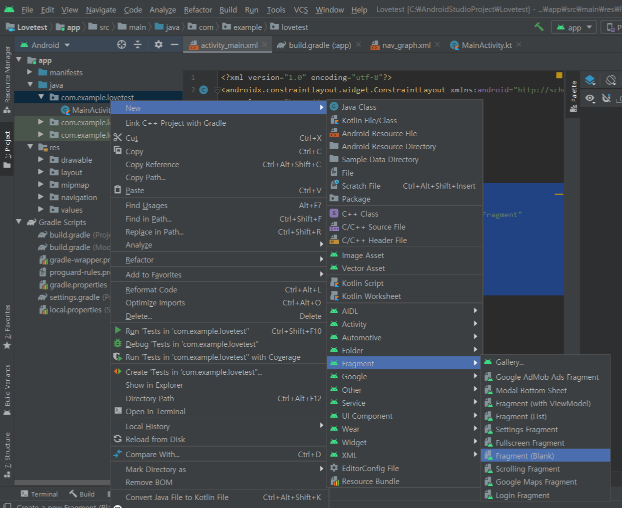 - nav_graph.xml 이 생성되는데 이것은 네비게이션상태를 눈으로 볼수 있게 GUI로 보여주는 것