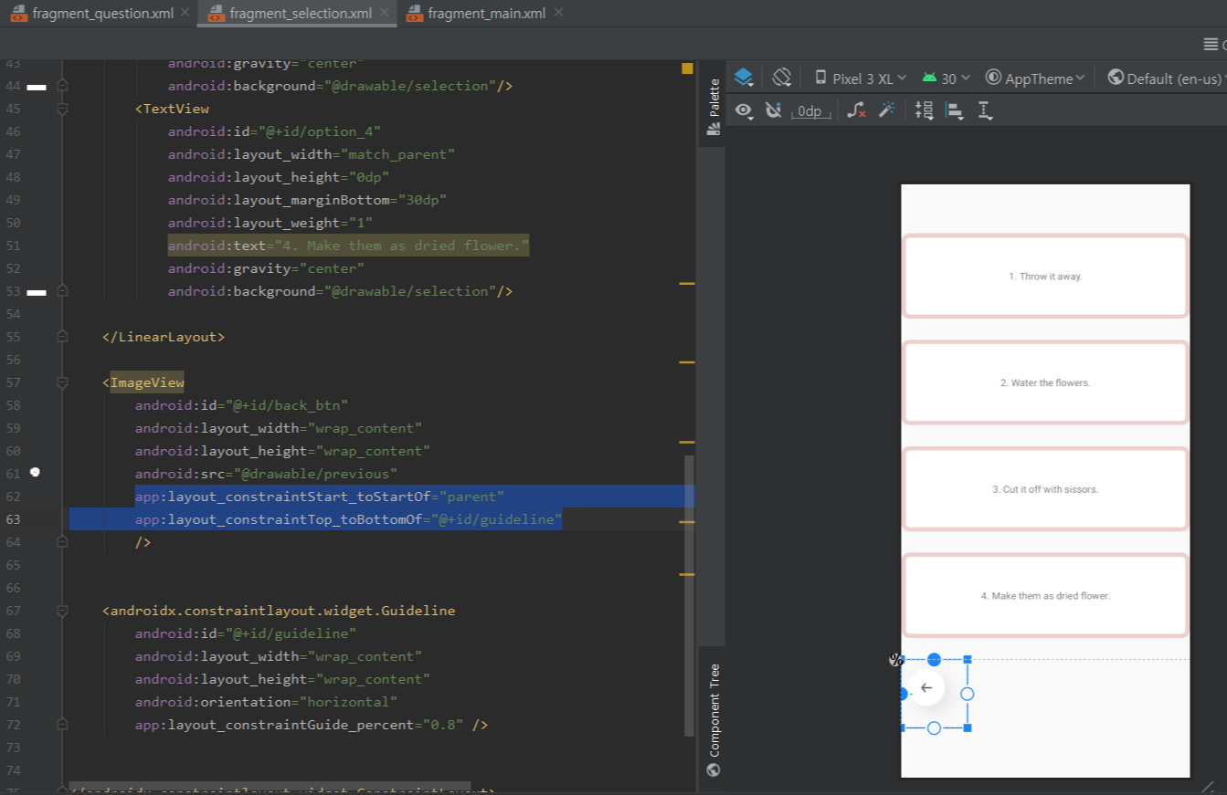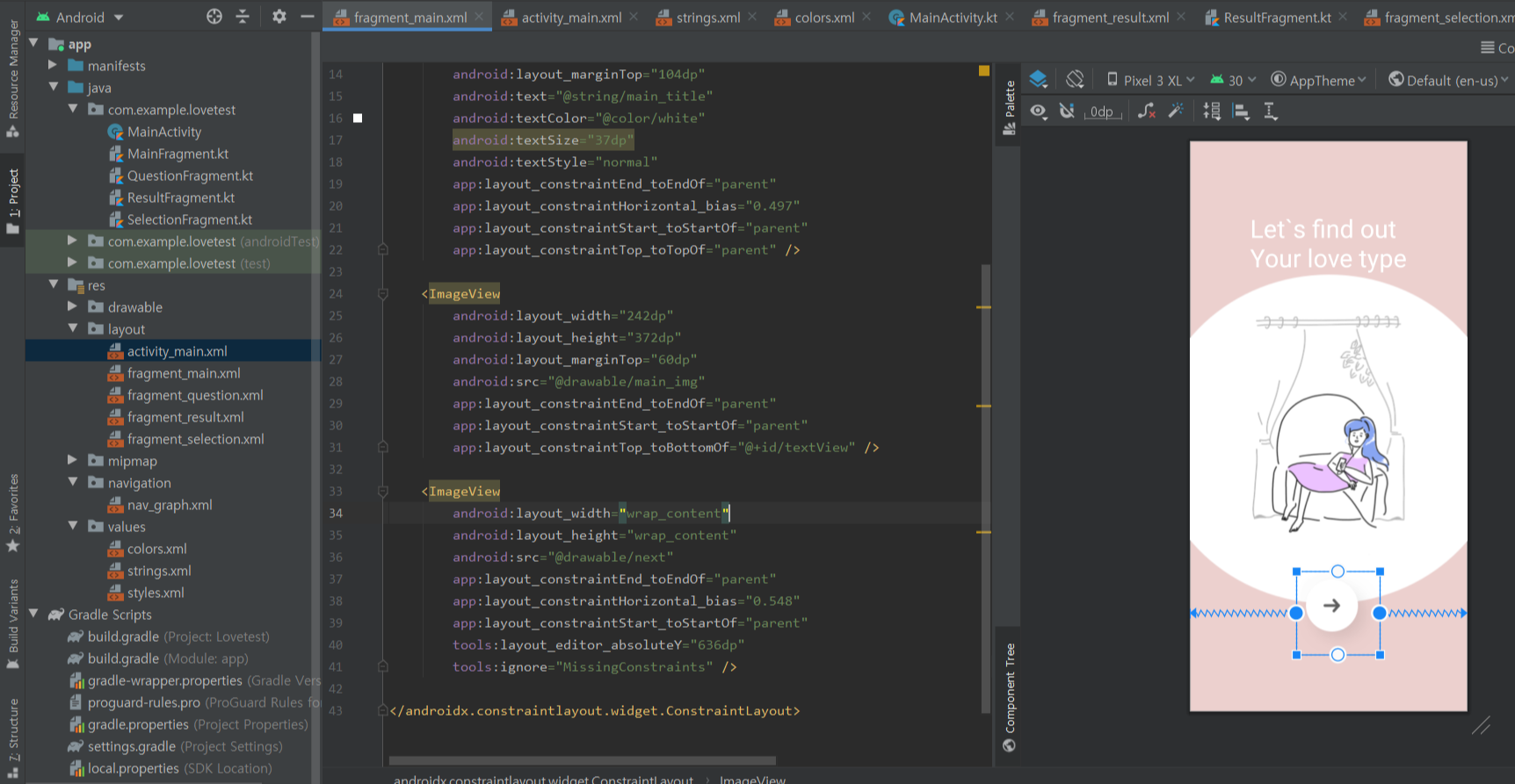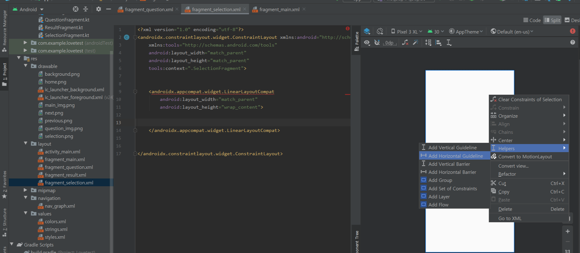 - 실습예제(1)에서 main_img를 디자인 했듯 같은 방식으로 fragment.question.xml을 디자인 해준다