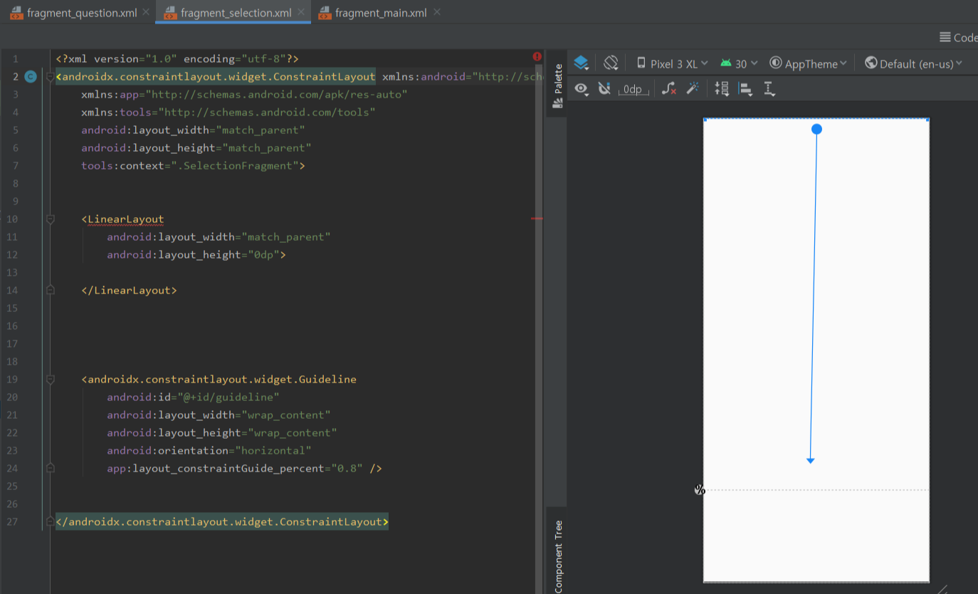 - 최 상단에 높이 0dp로 만들어진 LinearLayout의 중앙 원 부분을 드래그 하여 80%로 설정해 놓은 가이드라인 쪽을 향하여 드롭한다