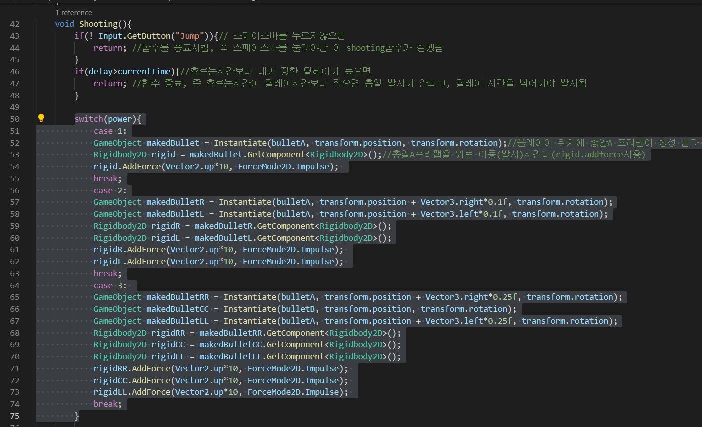 -shootin()함수에서 총알프리팹을 생성하여 위로 힘을줘 발사하는 코드를 switch문을 이용하여