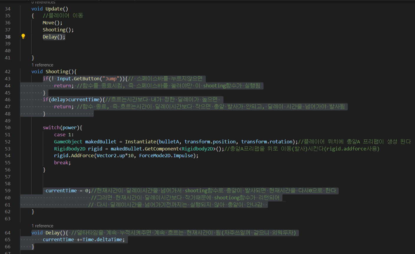 -상단에 public float delay; 를 주어 유니티 에디터에서 딜레이시간을 정해주고
