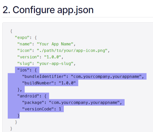 3)ios와 android에 대한 정보를 복사하여 app.json에 붙여넣기