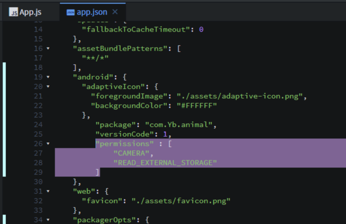 - app.json의 안드로이드 속성안에 코드추가(카메라, 앨범 권한)