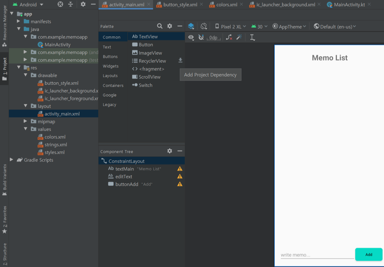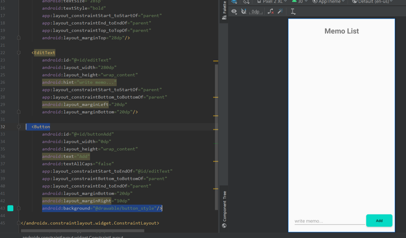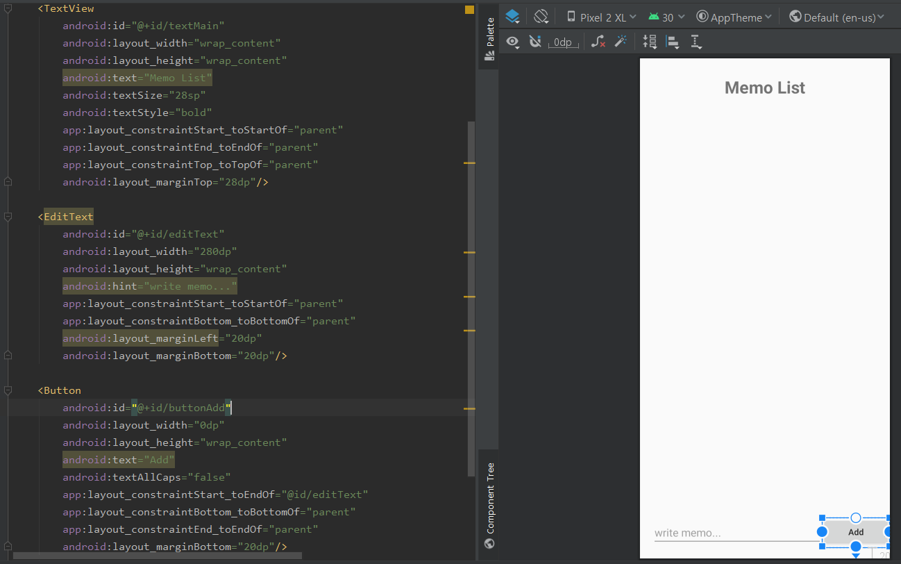 - 위는 ConstraintLayout을 수동으로 디자인뷰에서 드래그 앤 드랍하여Memo List 텍스트뷰에 드래그해서 중앙점을 붙여주고 아래는 Edit텍스트뷰에 드래그해서 중앙점을 붙여준뒤 heigt를 0dp으로준다