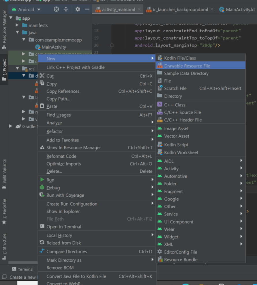 (1) - drawable 폴더에 우클릭 -> New -> Drawable Resourec File로 파일생성