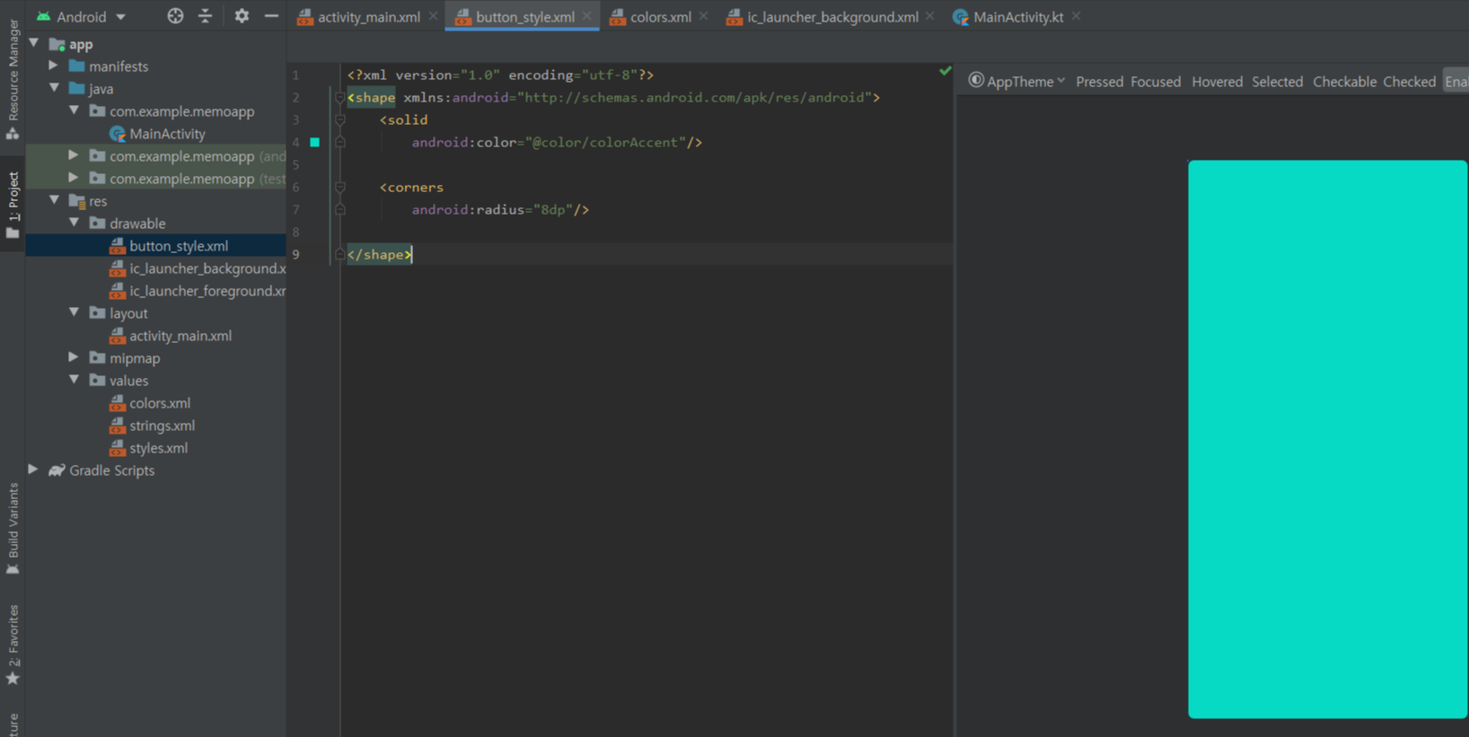 (3) . activity_main.xml의 <Button 태그안에 background속성으로 위에서 만든 button_style파일을 지정해준다