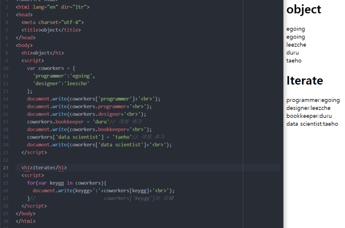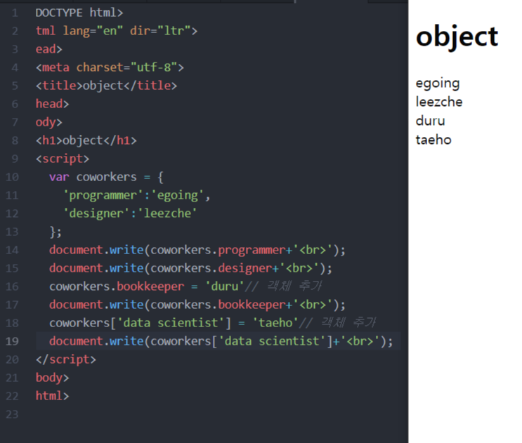 그러면 coworkers라는 객체에 egoing이라는 정보를 programmer라는 딱지를 붙여서 저장한 것