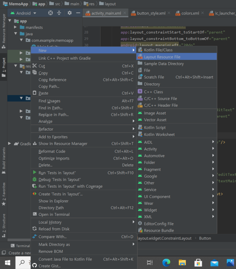 - layout폴더에서 -> New -> Layout Resource File 로 constraintLayout파일을 한개 만들어준다