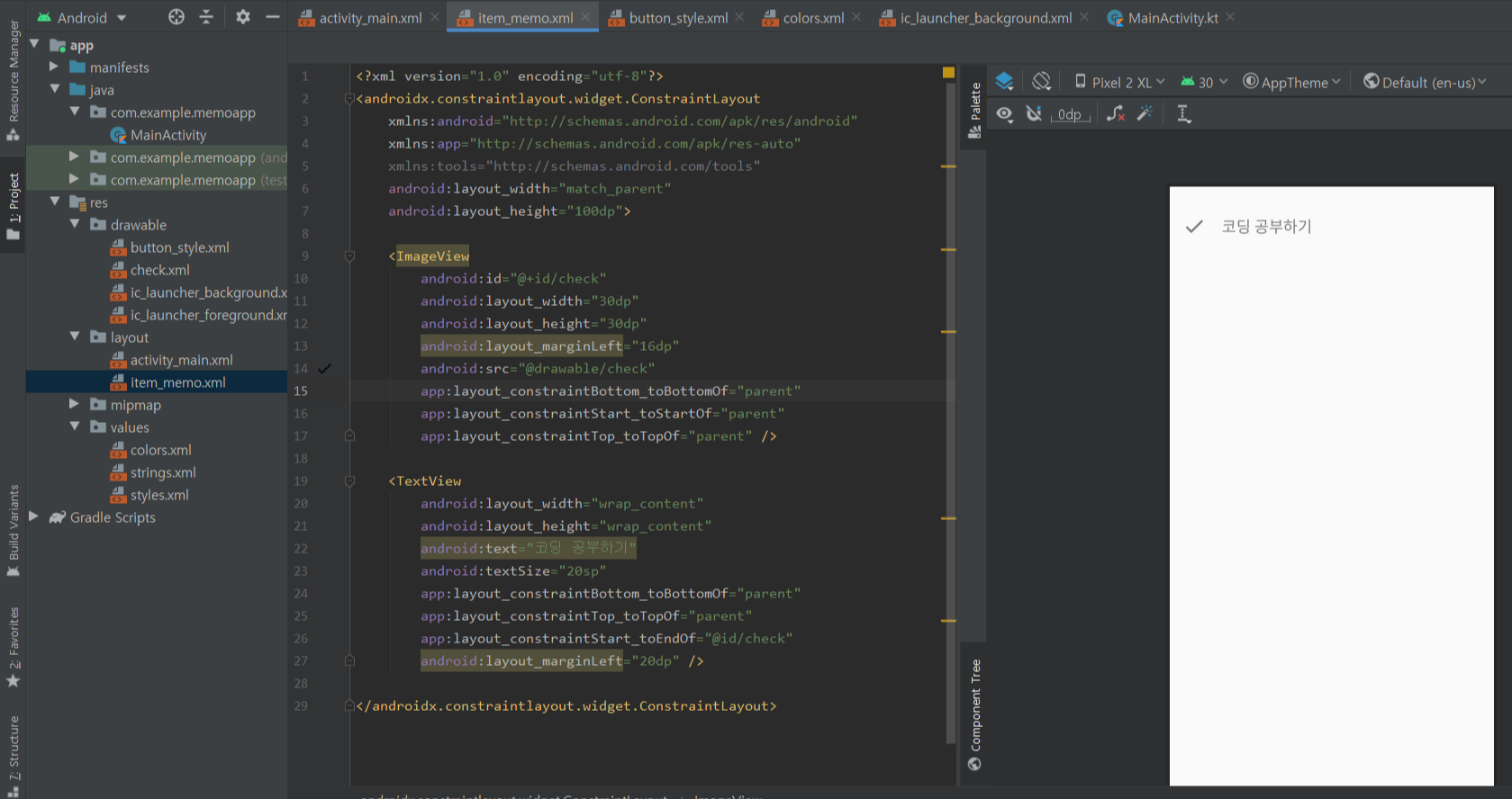 (3). (1)에서만든 새로운 Layout인 item_memo.xml에 (2)에서만든 이미지src를 가져와서 ImageView체크박스를 만들고