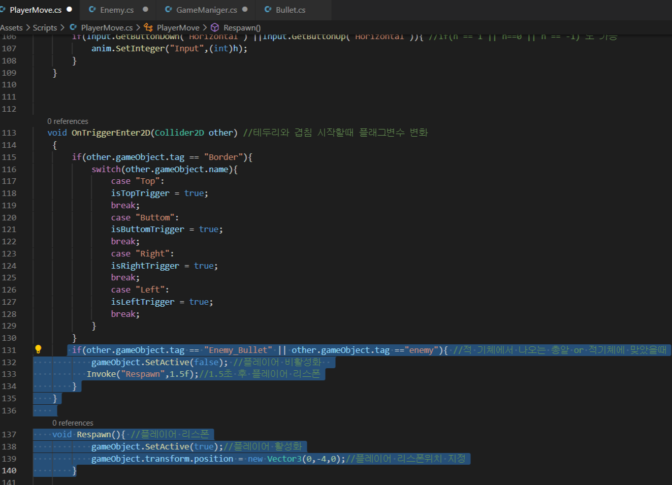 1. 적기체 or 적기체 총알에 플레이어가 피격 당했을때 리스폰