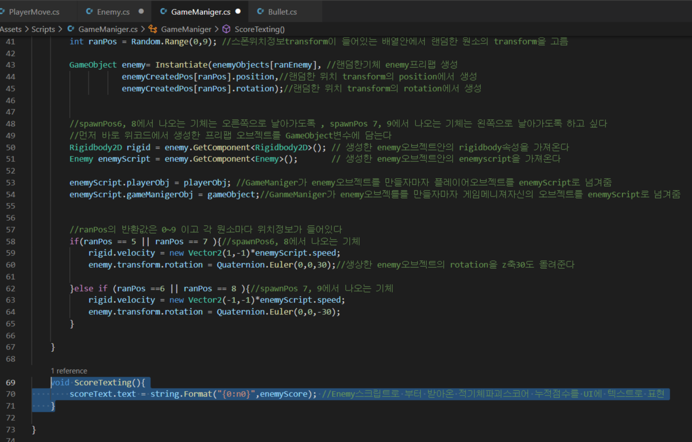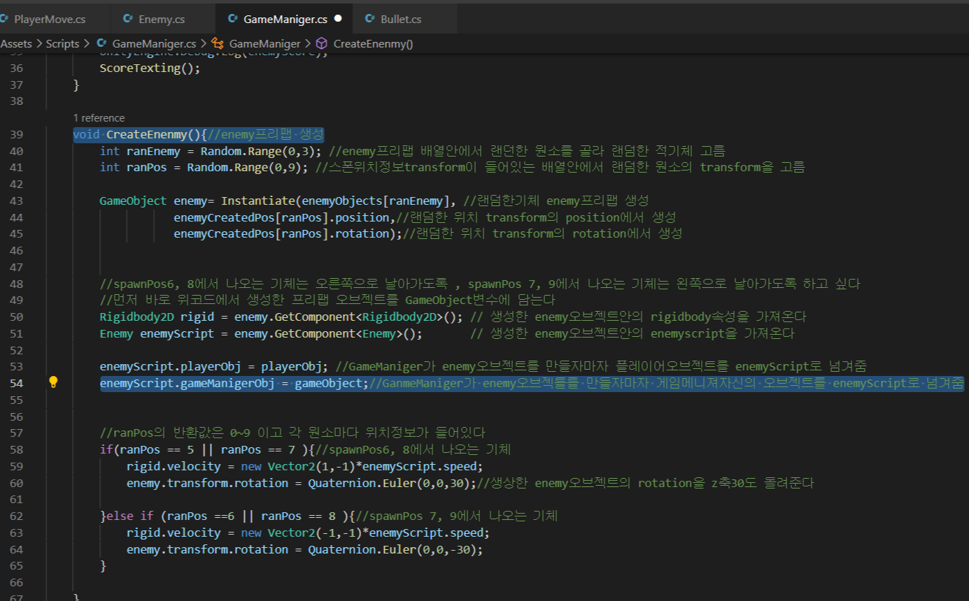 - 적기체를 생성할때 게임매니져 오브젝트를 적기체의 스크립트로 넘김(계층구조창에 존재하는 오브젝트의 정보를