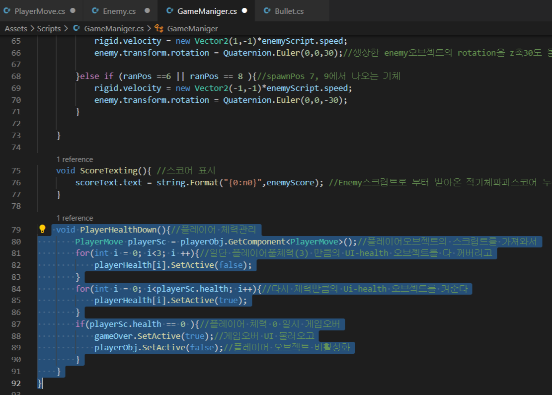 3. 한번에 총알2개를 맞아 2목숨이 깎이지 않도록 맞은상태임을 나타내는 플래그변수 활용