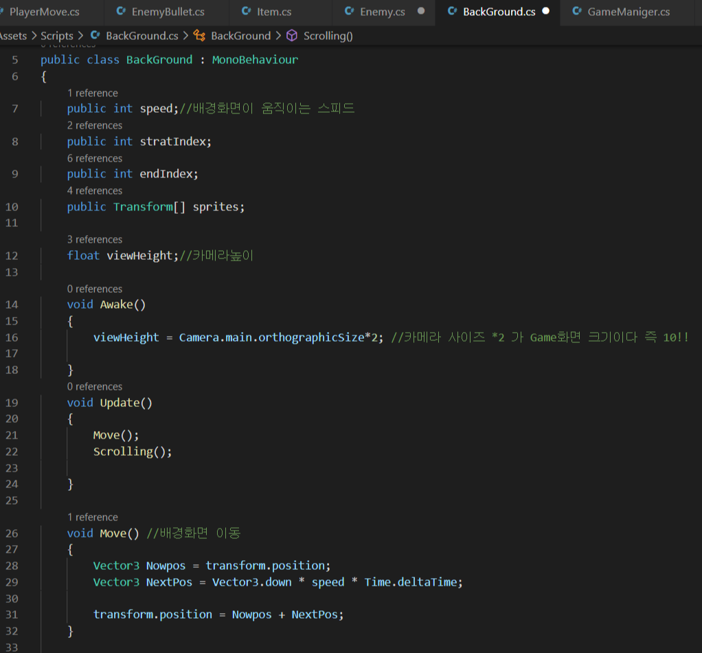 2. 카메라사이즈 = game화면 사이즈 따라서 코드로 가져오기, 배경스프라이트 아래로 이동시키기