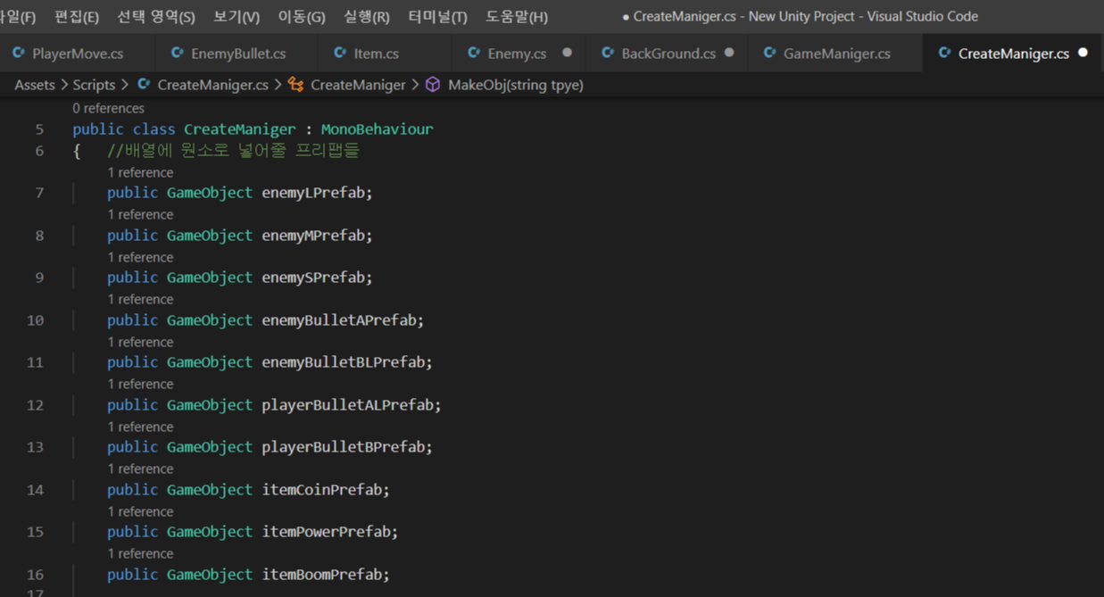 - MakeObj()이라는 함수를 다른 스크립트에서 사용함으로 인해 1회 사용시마다 타입에 따라 1개의 비활성화된 상태로 존재하고 있던 오브젝트를 활성화 시키는 형식으로 사용한다