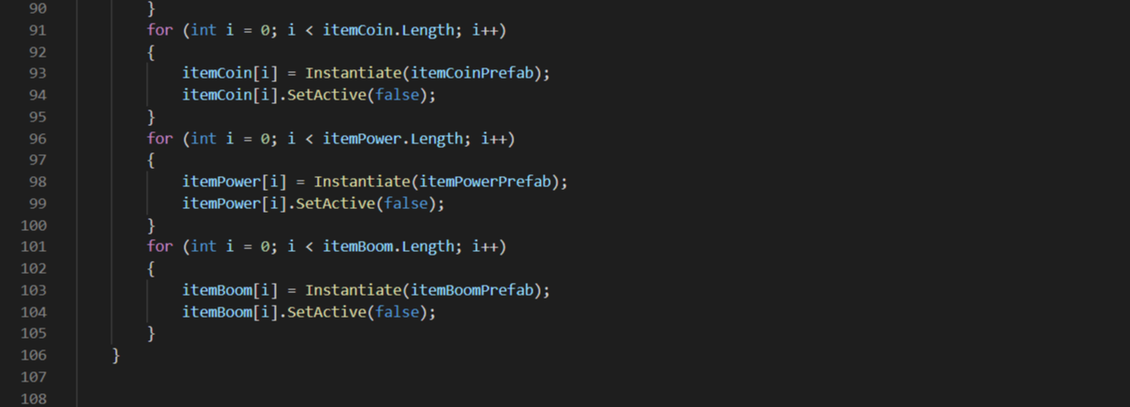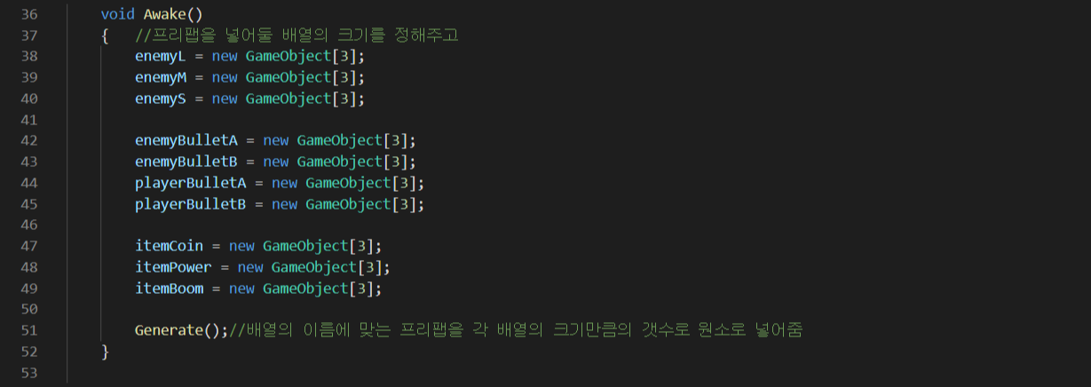 - 아래는 배열의 크기를 정해주고 그 크기만큼의 프리팹을 비활성화상태로 생성해두며