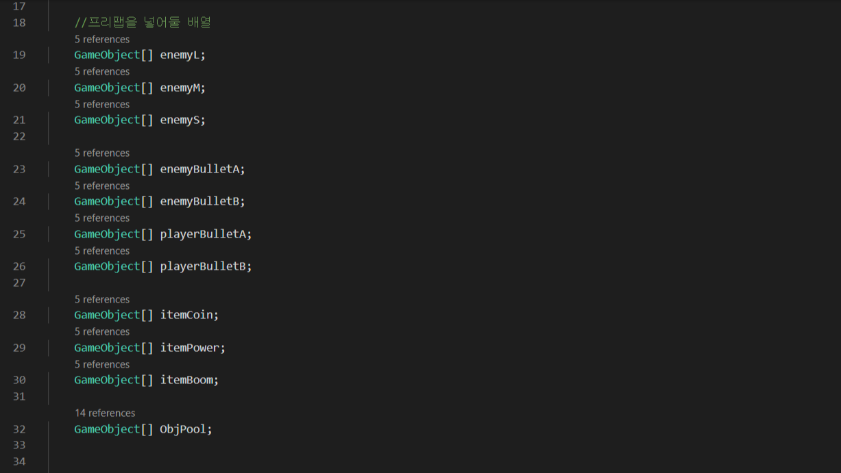 - 아래는 배열의 크기를 정해주고 그 크기만큼의 프리팹을 비활성화상태로 생성해두며