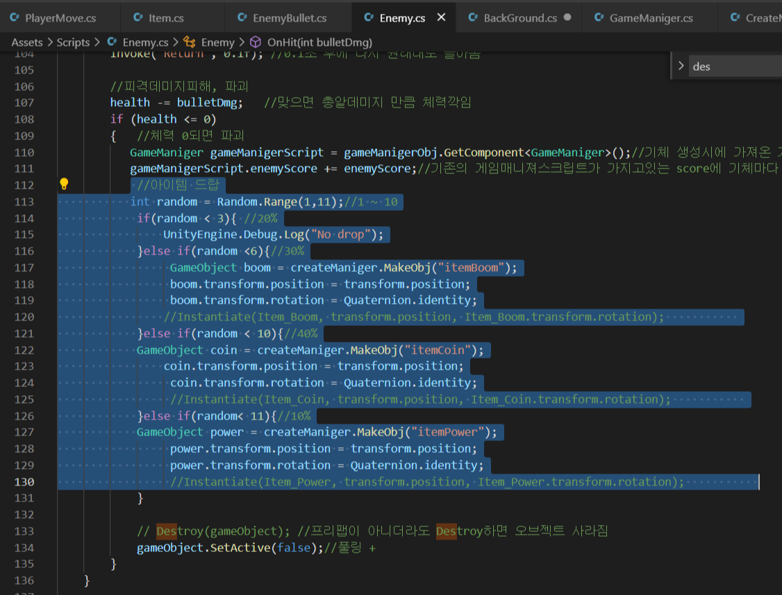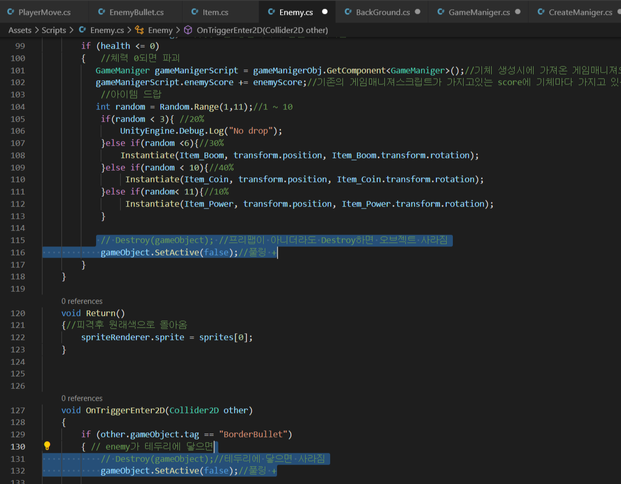 (2). Destroy(gameObject) 는 gameObject.SetActice(false);로 바꾼다