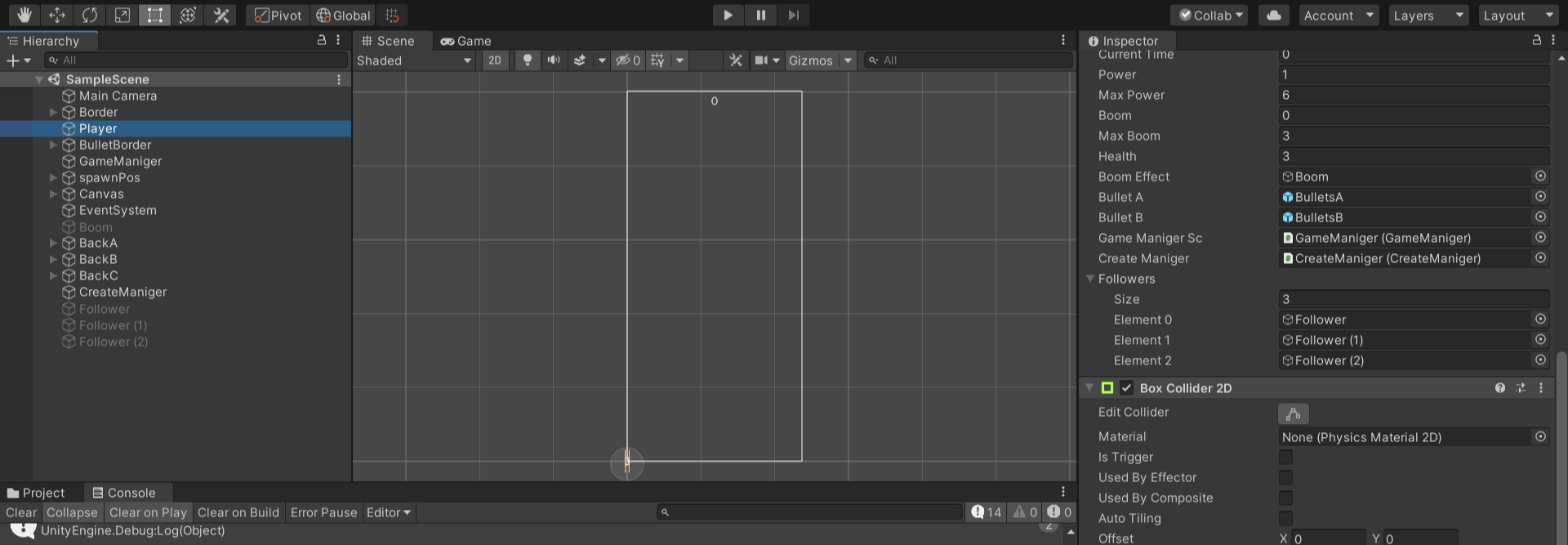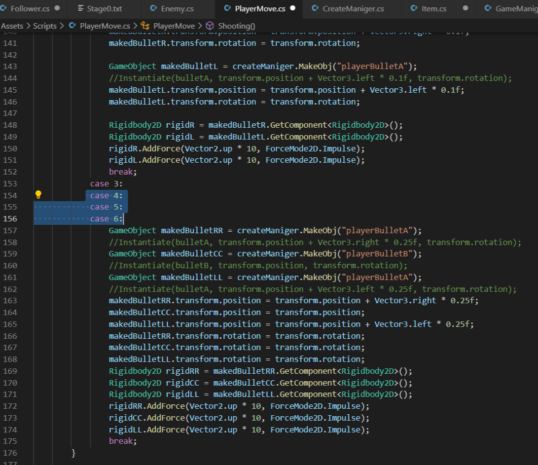 - 기본적으로 follower오브젝트가 총알을 발사하도록 followerBullet 프리팹을 만들어 createManiger에서 프리팹을 풀링하도록 추가하고 총알 발사 기본로직 구성