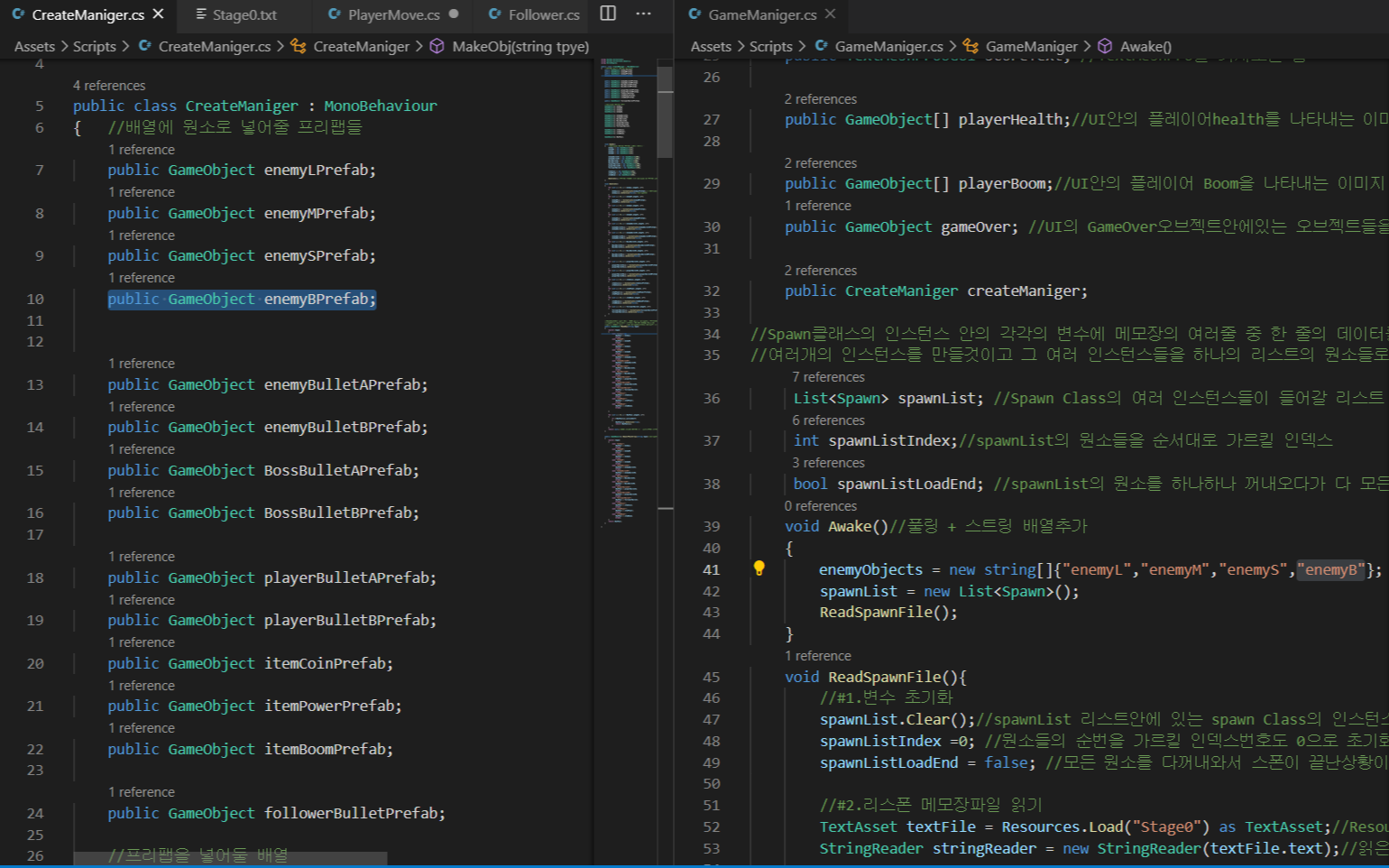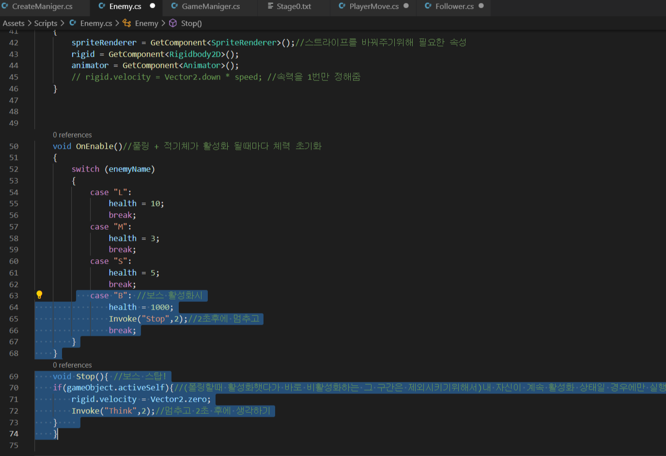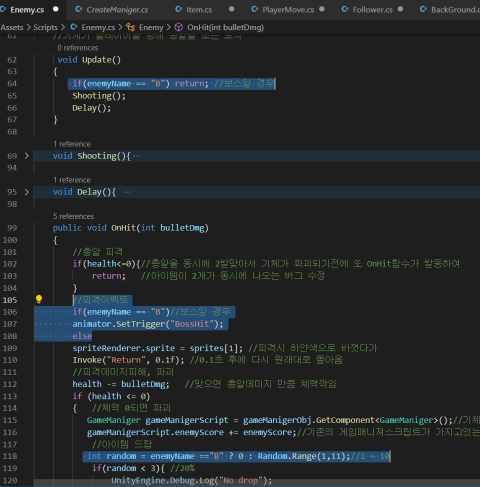 - 보스 오브젝트에 Enemy스크립트를 주고 보스와 관련된 코드를 추가로 구현해 준다