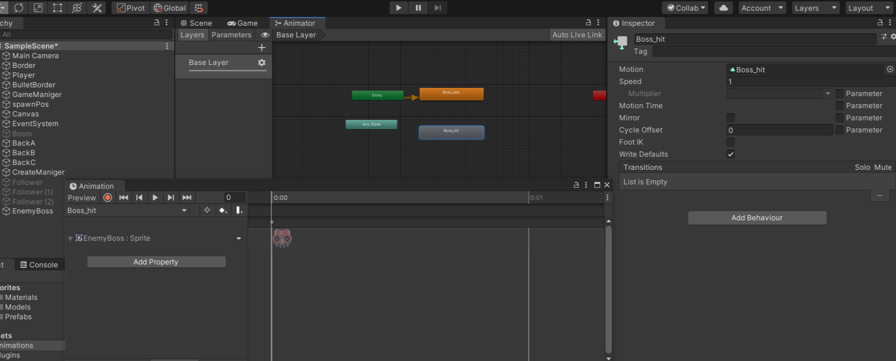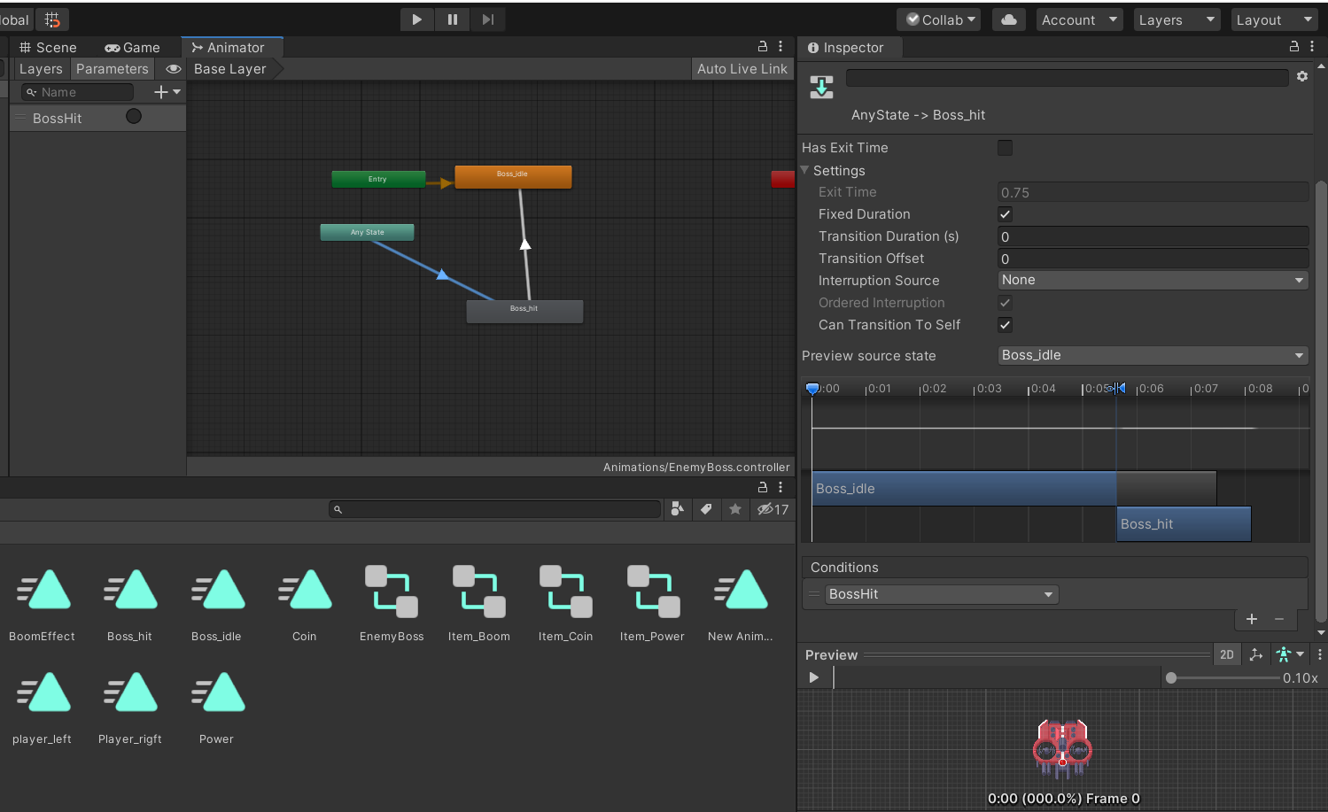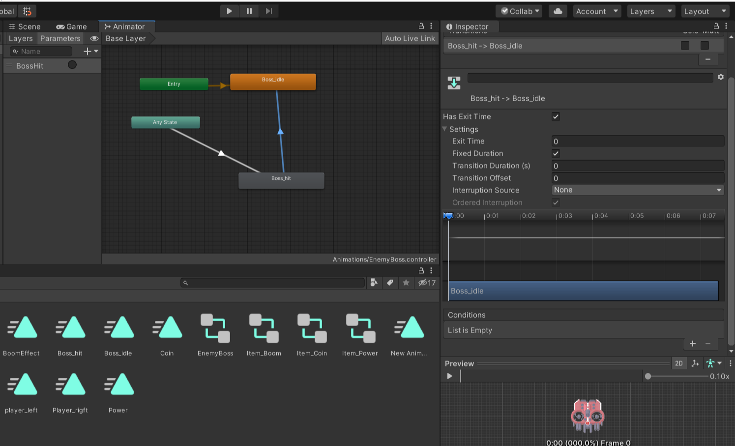 - Any State -> Boss_Hit으로 가는 트랜지션은 BossHit이라는 트리거를 주고 Has Exit Time은 체크해제