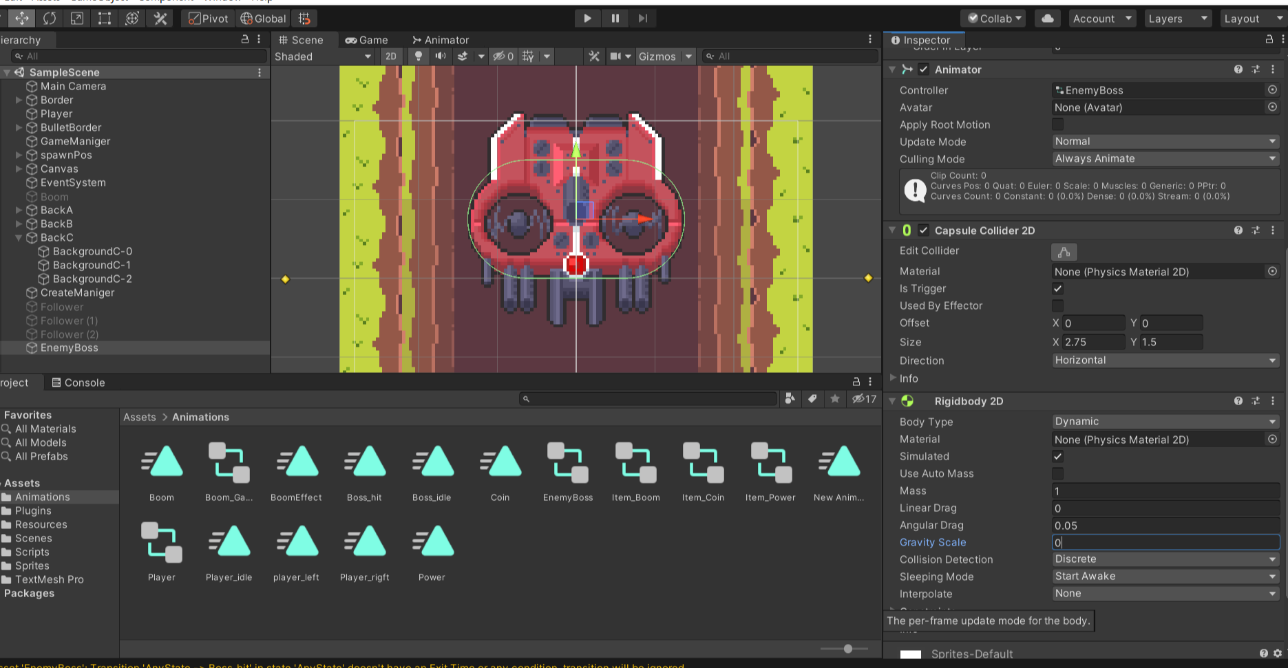 - Boss오브젝트를 만들어서 Direction을 Horizontal로하고 콜라이더를 조정해주며 리지드바디도 추가해준다 중력스케일 역시 0으로